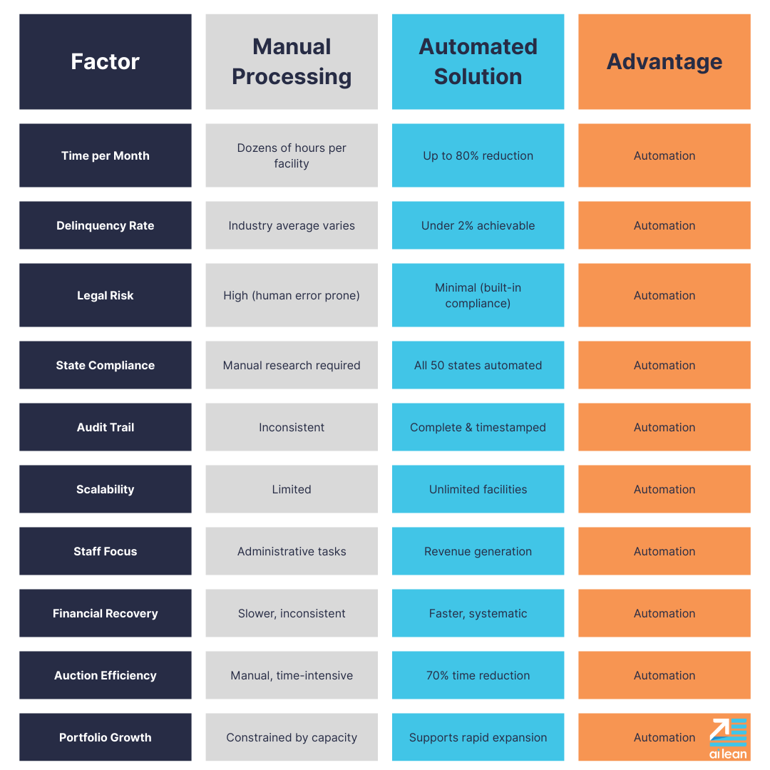 The choice between manual lien processing and automation represents a fundamental decision about how self-storage operators allocate resources, manage risk, and position for growth.